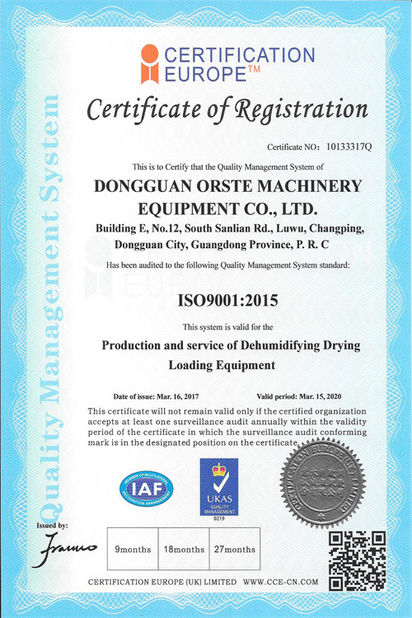 Standard:ISO Certificate Number:10133317Q Issue Date:2017-05-16 Expiry Date:2027-05-16 Scope/Range:Dehumidifier Dryer Loader Issued By:CERTIFICATION EUROPE (UK) LIMITED |