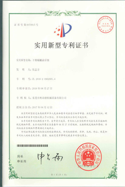 Standard:Patent Certificate 1 Number:ZL201620967677.7 Issue Date:2017-04-05 Expiry Date:2067-04-05 Scope/Range:OCD-H series Issued By:China National Intellectual Property Administration |